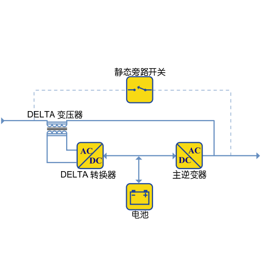 ? UPS設計是一種較新的設計,這種十年前引入的技術,它克服了雙轉換在線式設計的缺點,適用于功率范圍5kVA到1.6MW的應用領域。與雙轉換在線式設計相似,?Delta?轉換在線式UPS始終由逆變器提供負載電壓。然而,附加的Delta轉換器也向逆變器輸出供電。在交流電源出現故障或受到干擾的情況下,這種設計所表現出的行為與雙轉換在線式設計完全相同。